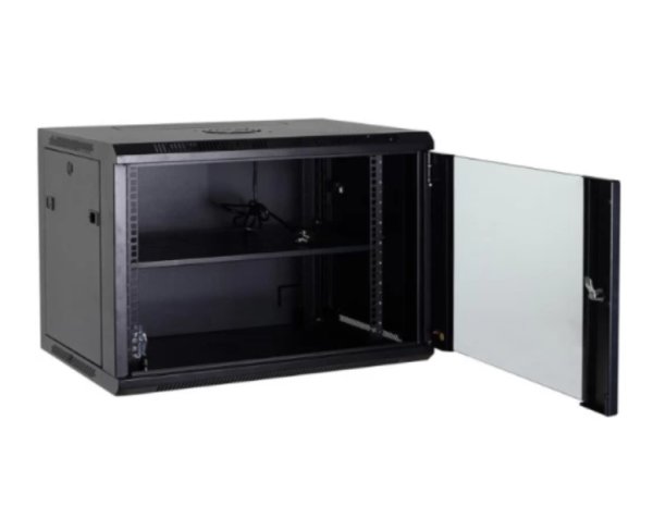 Dimension: 600 x 368 x 450 (+/- 2mm) Type Cabinet: Wall mounted Capacity: 6U Material: Cold rolled steel SPCC, powder coated Front door: Tempered glass with lock Color: Black RAL9004